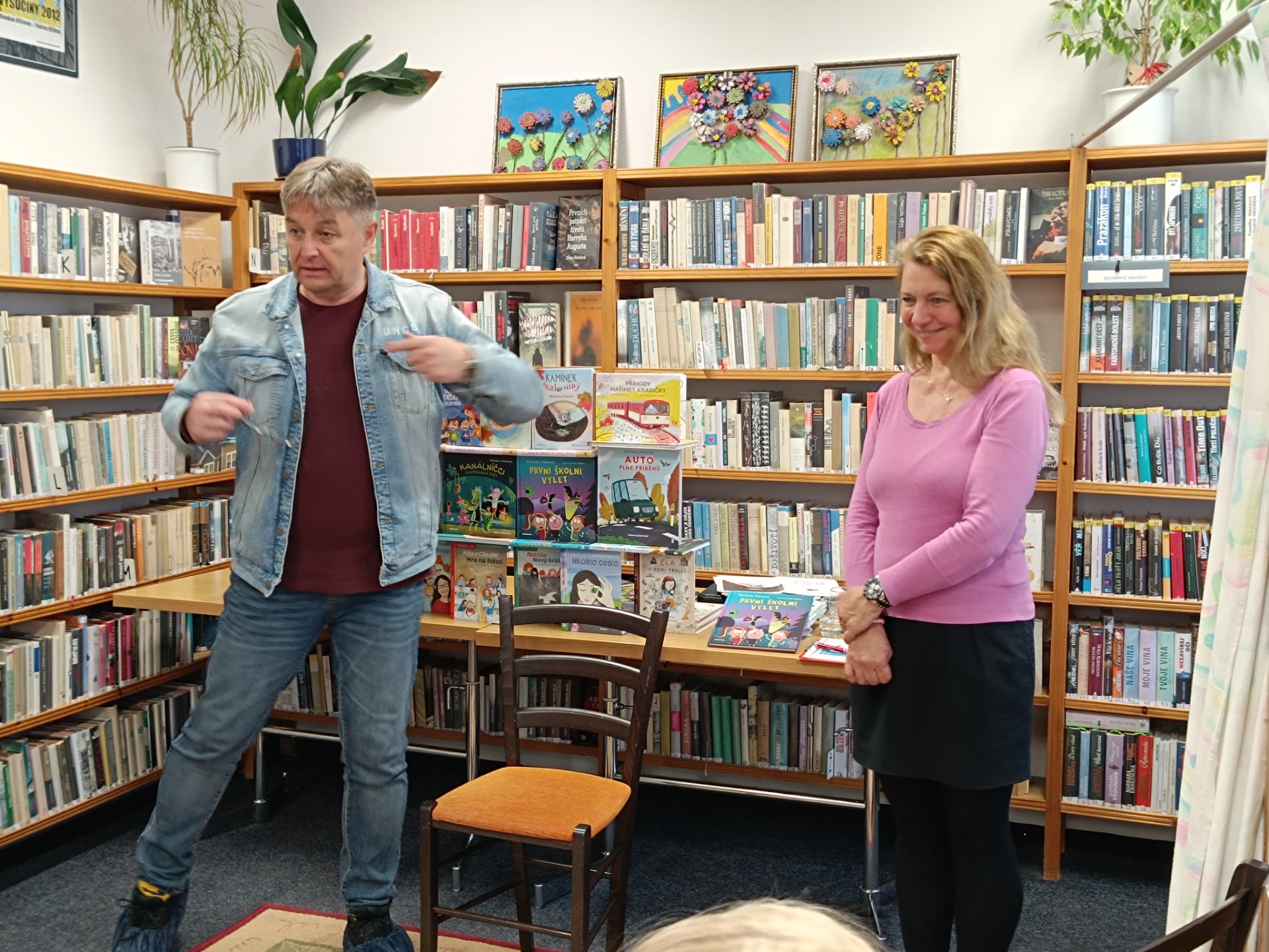 25.3. března byl pro nás velkým svátkem! Paní Fišarová a pan Reil perfektně zaujmou i velikou skupinu dětí, jak ukazují fotografie z tělocvičny. Tedy celkem 120 dětí ve dvou besedách a pak odpoledne v knihovně. Paní Fišarová už má na svém kontě celkem 23 knih, většinu pro mladší čtenáře.